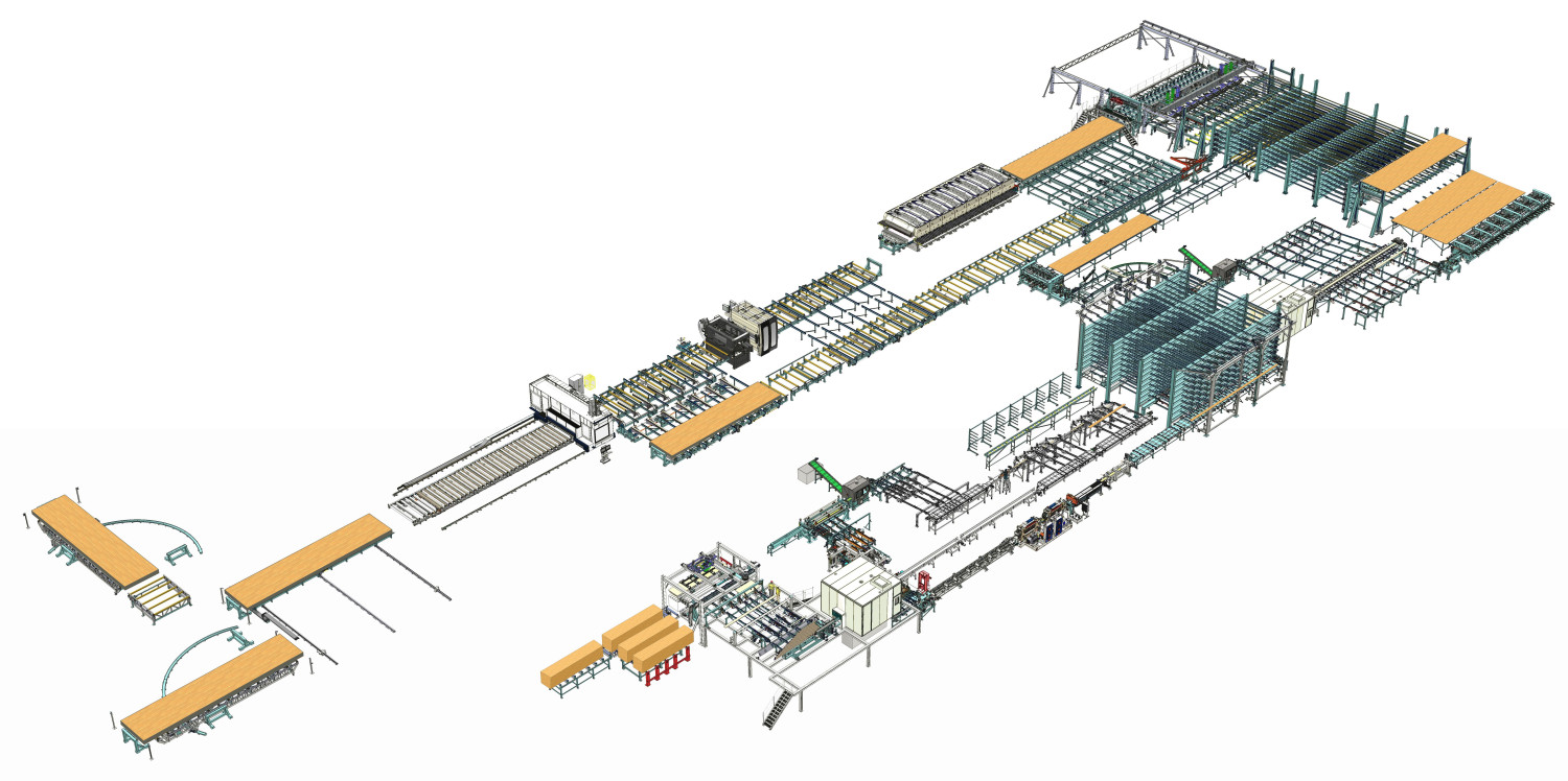 The entire CLT production line is controlled with the X-Lam Manager, a PC-based master computer system developed by Ledinek Engineering that provides production management, production flow control and visualization, statistics, real-time information and production analysis tools.