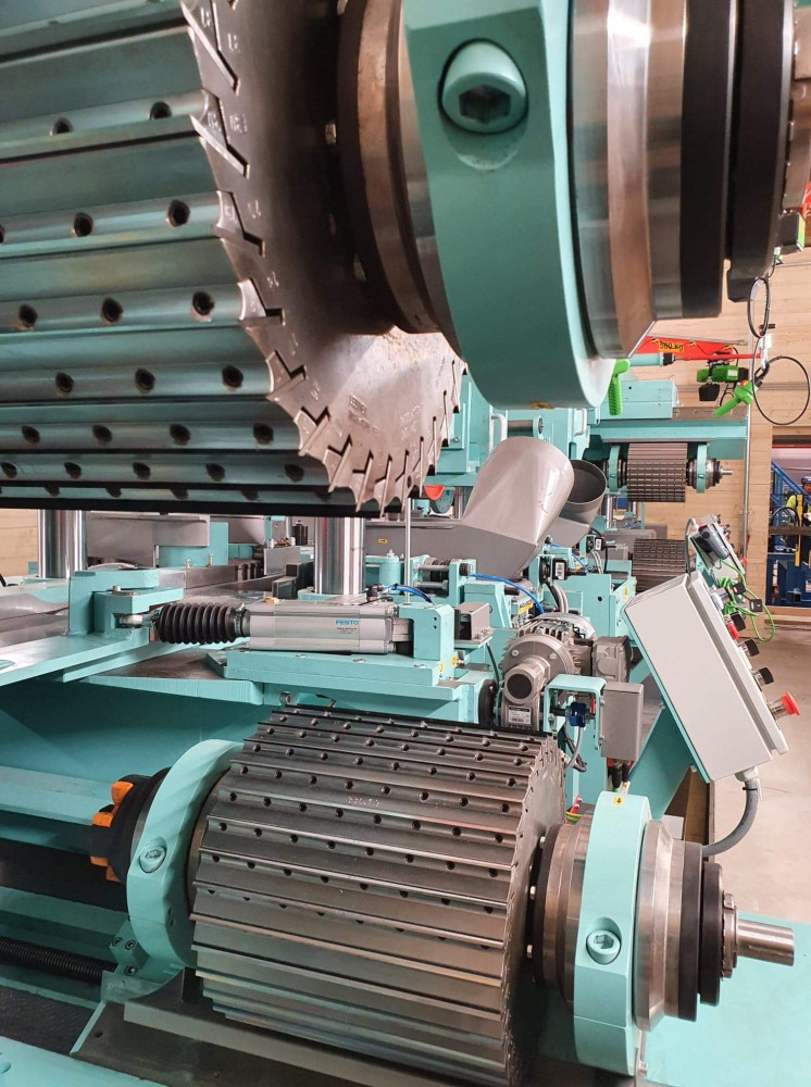 Alles an dieser Maschine dreht sich um die Geschwindigkeit und alles ist optimiert für Hochgeschwindigkeitsbeschickung. Große Werkzeuge mit der maximalen Anzahl von Hobelmessern, großen Vorschubwalzen mit einem speziellen Zahnprofil und einem effektiven Transmissionssystem, das die immense Vorschubleistung von 200 kW an die Vorschubwalzen überträgt. Wassergekühlte Tischplatten, Druckschuhe und Führungslineale sowie eine Hightech- Keramikbeschichtung sorgt dafür das die entstehende Reibungswärme abgeführt wird.
