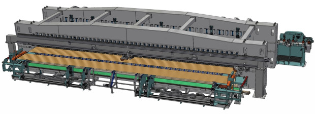 Rotary press for commissioning goods. Straight glulam. Stepped batches. Four pressing beds. Motorized clamping. Short loading and curing time.