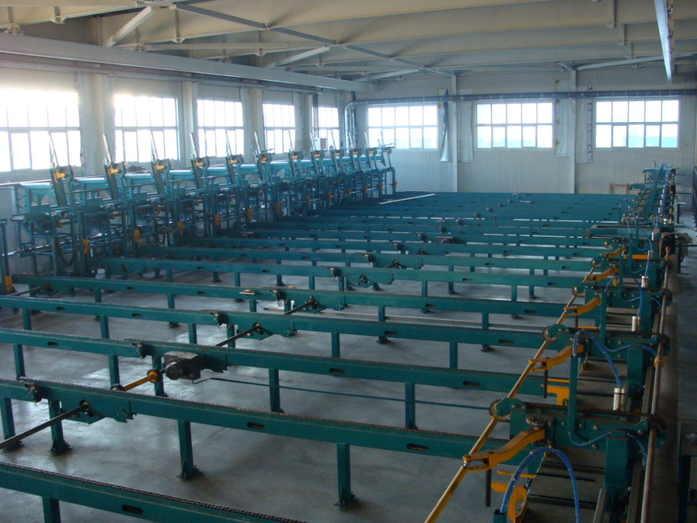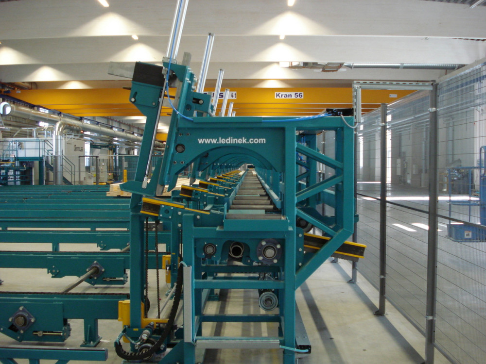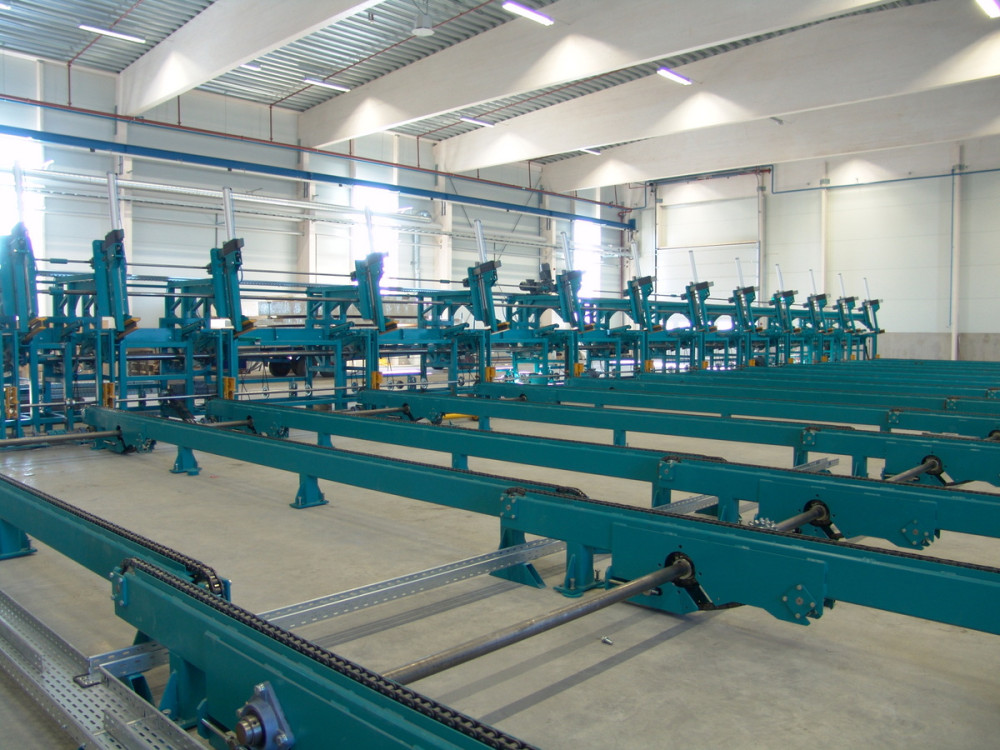 Finger jointed lamellas require a curing period during which the glue will harden to facilitate further processing. Floor storage stacks lamellas in blocks which are transported on a heavy duty chain conveyor. It can handle large volumes of material and is especially suitable for glues with longer curing time and pressing of large object laminated timber.