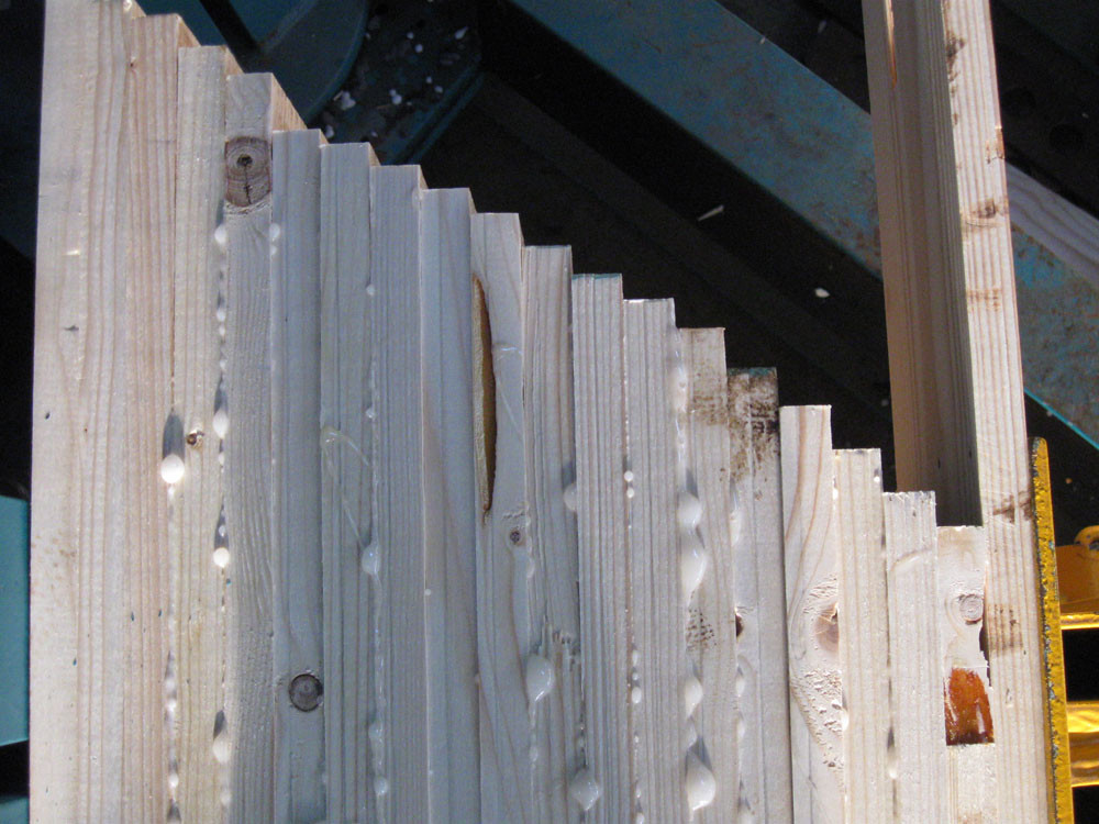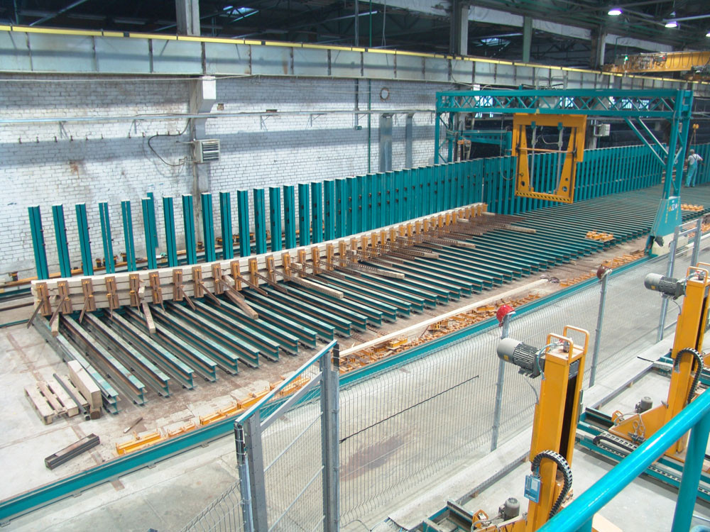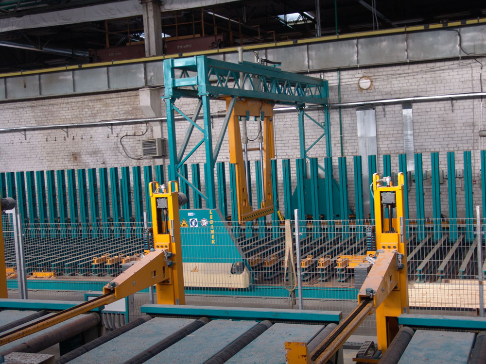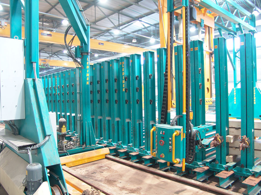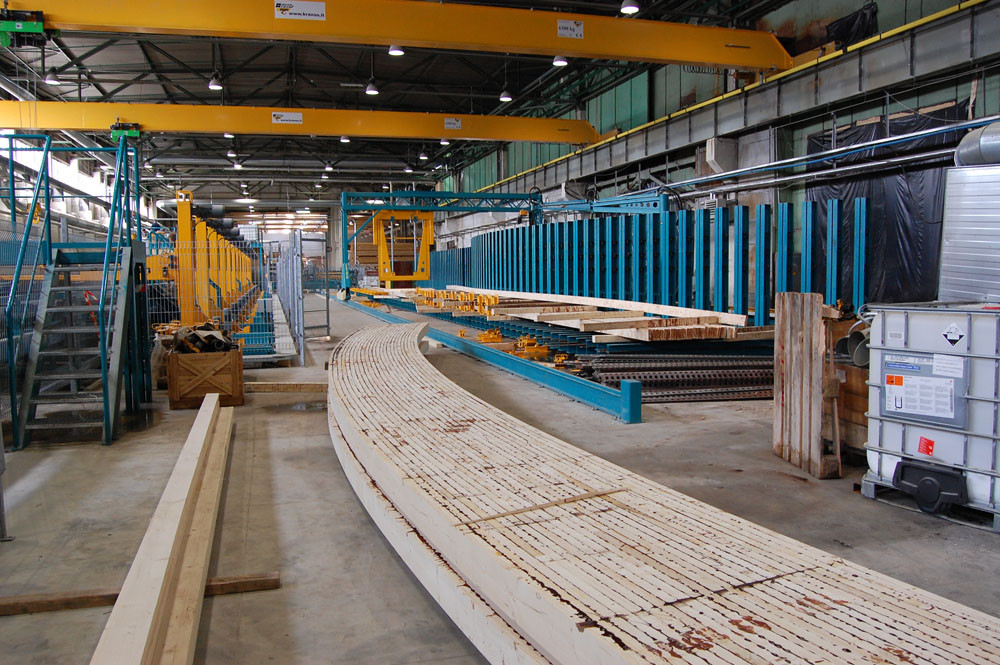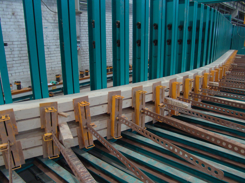 This press can produce straight or curved laminated beams, blockhouse- or ceiling elements, narrow, extra wide, cambered or stepped beams. Pillars are positioned manually, clamped to a correct angle. Hydraulic tightener is mounted on tracks. Press uses unique super fast locking and unlocking system.