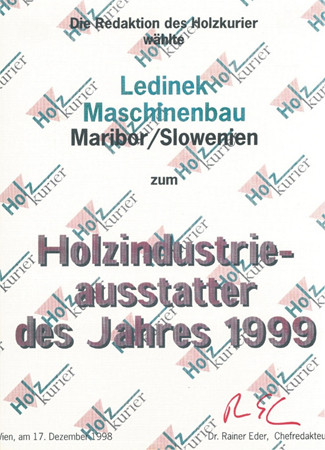 »Due to its inventiveness, the Ledinek company became the timber industry exhibitor of the year 1999 and 2004 chosen by Holzkurier« Source: Holzkurier, 29.4.2004, page 20