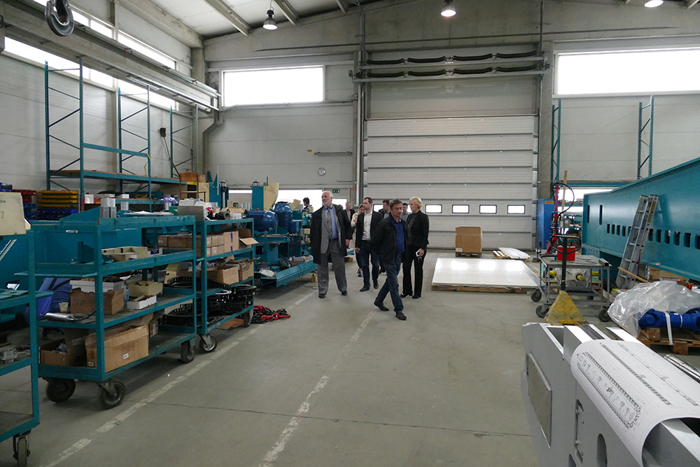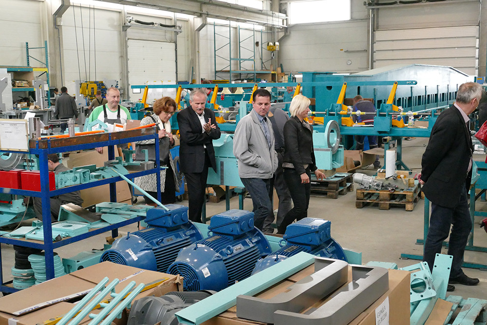 Gostje so si ogledali naše proizvodne prostore in procese, ki potekajo v njih. Ogledali so si montažo sestavnih delov v končne izdelke, ki jih prodajamo na svetovnem trgu najsodobnejšim proizvajalcem konstrukcijskega lepljenega lesa. Predstavili smo jim tudi oddelka konstrukcije in elektroprojektive, kjer najprej nastajajo stroji nato pa še programi za njihovo delovanje.
