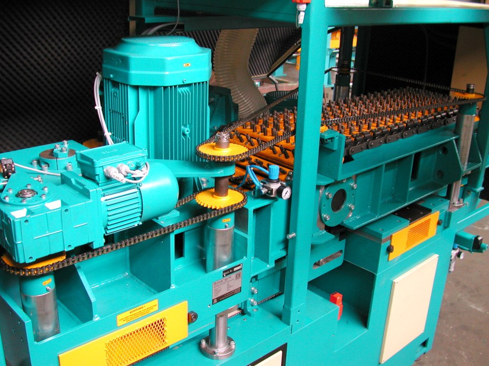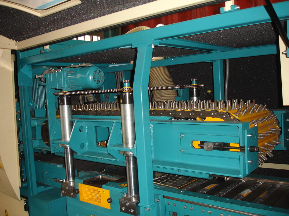Machine with bottom and top rotor as well as feeding chain above and feeding belt below, is used for planing of boards of various widths.