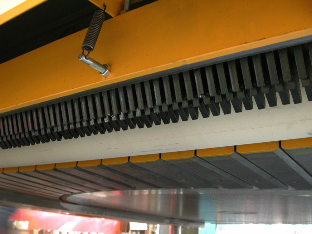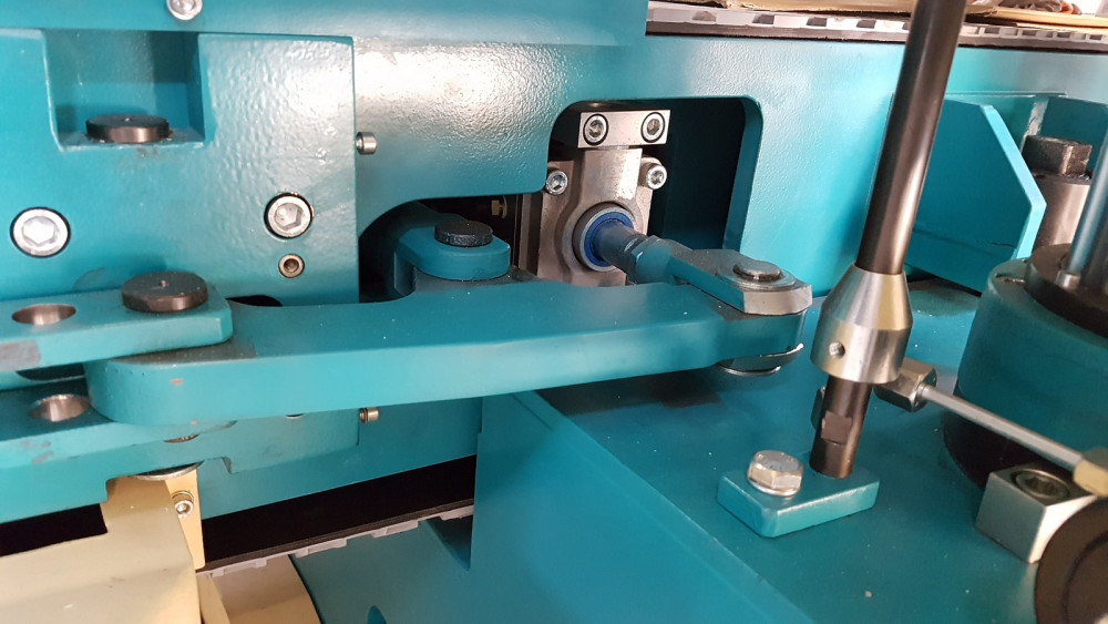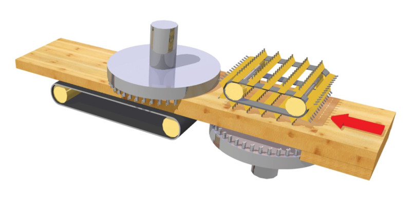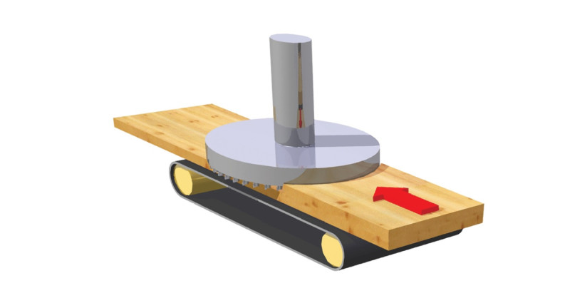 Machines with a top rotor and feeding belt below are used for calibration of very thin workpieces, such as hardwood top layers for production of engineered flooring.