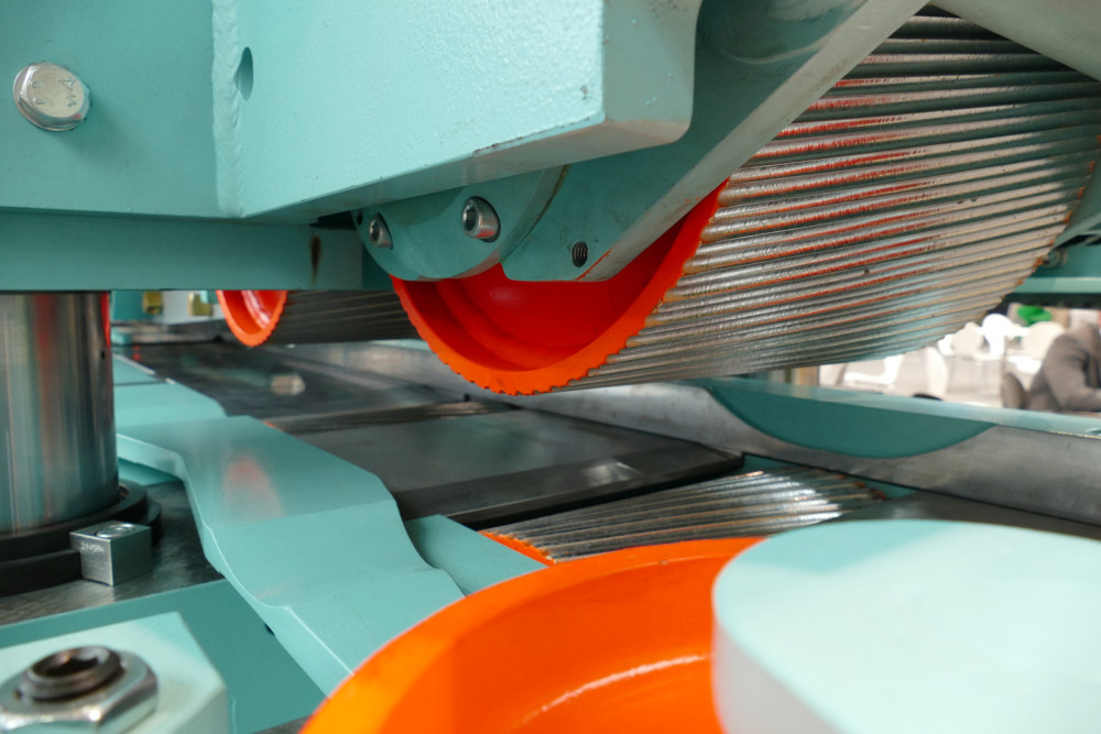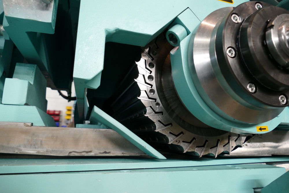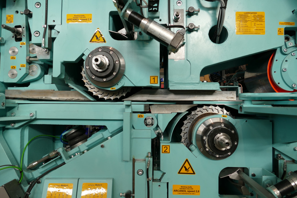 Board is pushed UP, against the fixed plate. Final calibration to required thickness, due to variation of cutoff on the first shaft, all material has been saved on the thinnest spot.