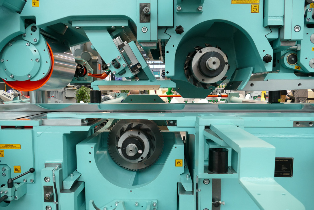 Included on all Stratoplan VA type planers (can not be combined with other types) is the active assisted floating of vertical spindles. Every board is independently scanned as it approaches the planing units. In real-time an original LEDINEK software calculates the movement of vertical units which follows the curve of the boards.