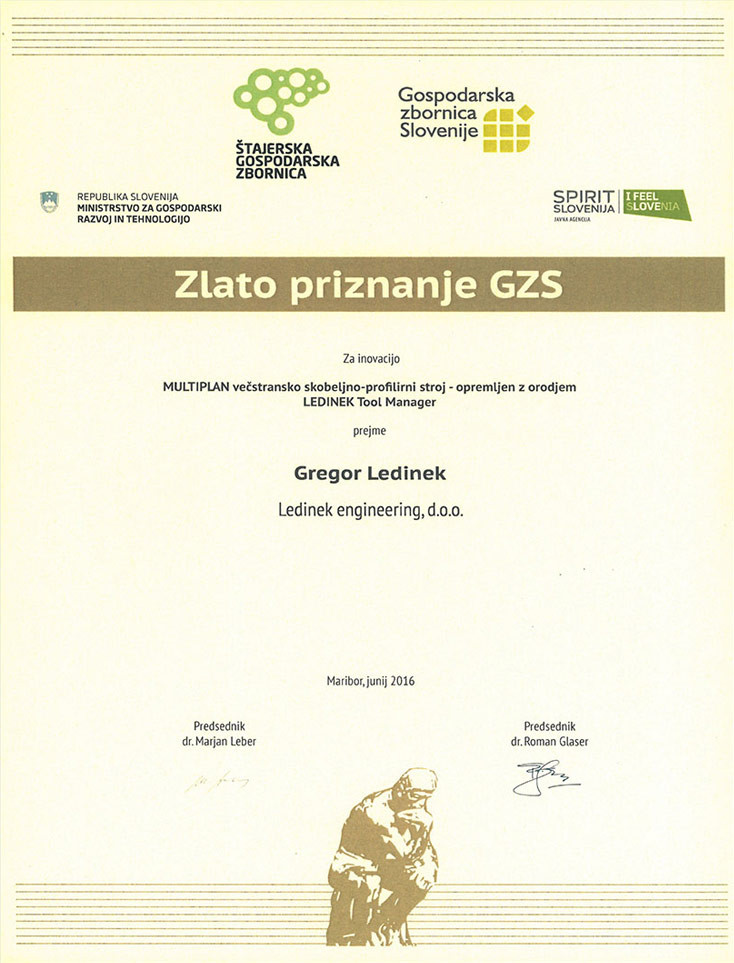 Ponosni smo, da je med tremi zlatimi nagrajenci znova tudi naše podjetje Ledinek Engineering d.o.o. z inovacijo Multiplan, večstransko skobeljno-profilirni stroj, opremljen z orodjem Ledinek Tool Manager. Gre za računalniški program, ki komunicira z napravo za merjenje orodij ter krmilnikom na stroju, hkrati pa vsebuje tudi bazo orodij in profilov, kar dejansko omogoča naprednejše delo na stroju. Program povezuje vsa potrebna orodja za izdelavo nekega profila/izdelka ter dimenzijske in osne pozicije obdelovalnih osi na skobeljnem stroju. Z merilnim sistemom izmerimo geometrijo orodja ter prilagodimo nastavitve stroja tako, da po skobljanju dobimo željeno obliko in dimenzijo izdelka. Evropska lesna industrija teži k zmanjšanju stroškov proizvodnje majhnih količin izdelkov, ker lahko na tak način zadovolji potrebam širšega kroga kupcev, tudi tistih ki potrebujejo majhne količine zelo različnih izdelkov. Tak način proizvodnje pa zahteva hitro prilagajanje na spremembe oziroma zamenjave nastavitev, ter enostavno in učinkovito posluževanje stroja. Prav to omogoča stroj Multiplan v povezavi s Tool Managerjem; kratke čase menjave orodja, hitro nastavljanje in optimalno prilagodljivost.